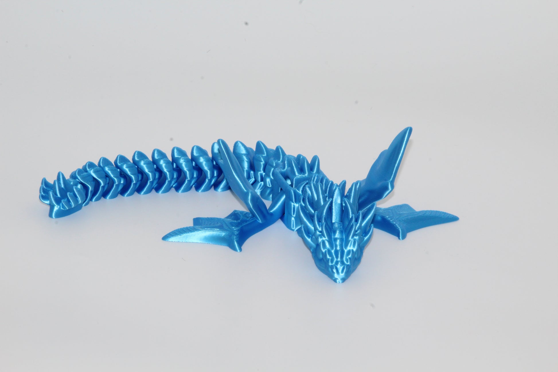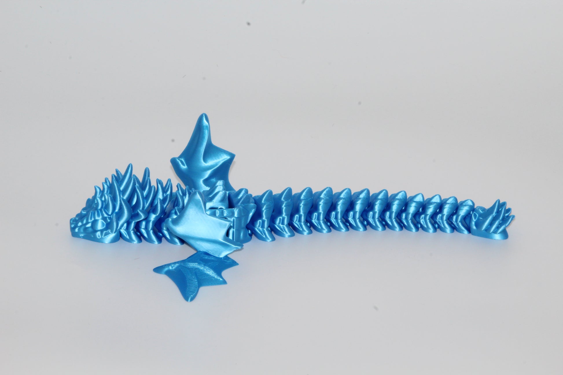 Slip fantasien løs med denne imponerende 3D-printede vingedrage, der kombinerer et detaljerigt draghoved, brede vinger og en fleksibel, leddelt hale. Den metallisk blå overflade giver figuren et elegant, næsten magisk skær, der gør den perfekt til både udstilling og leg.