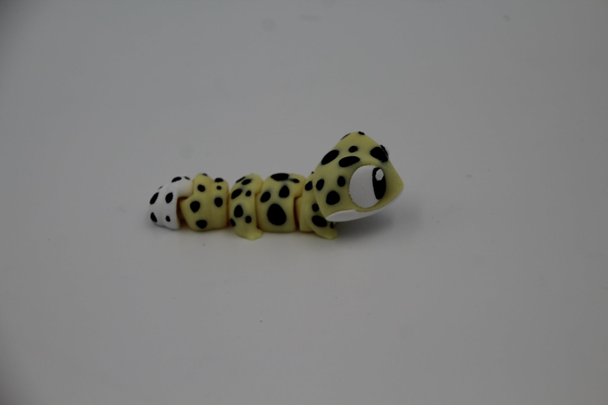 Bring et smil frem med denne håndlavede 3D-printede leopardgekko, som med sine store øjne, livlige farver og fleksible led er perfekt som gave, samlerfigur eller sødt skrivebords-kæledyr. Figuren er inspireret af den populære leopardgekko og printet i høj kvalitet med præcise detaljer og flotte pletter.