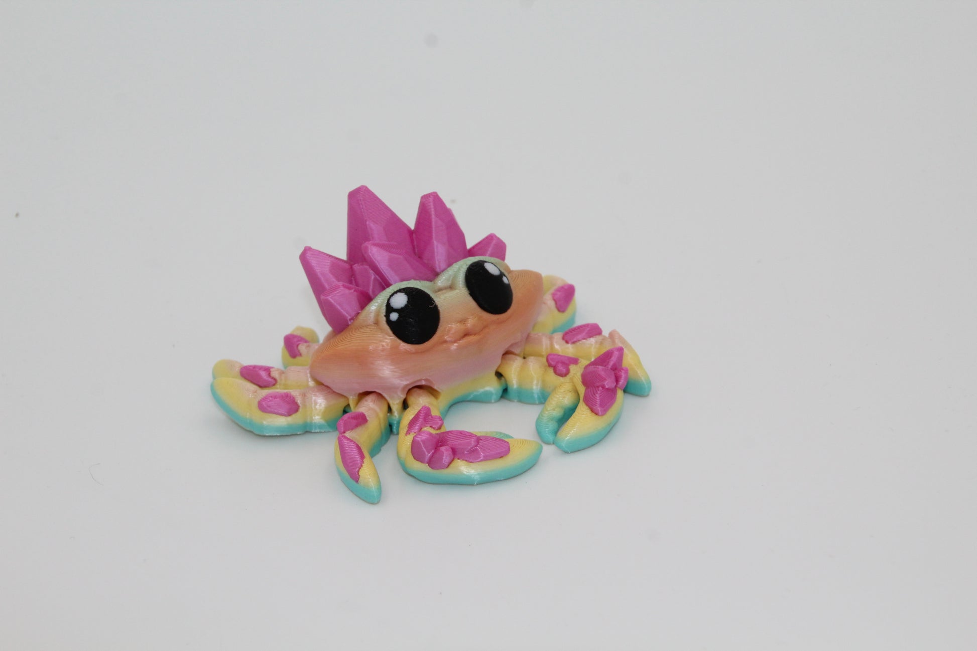 Flerfarvet krabbe med sølvlysende elementer.